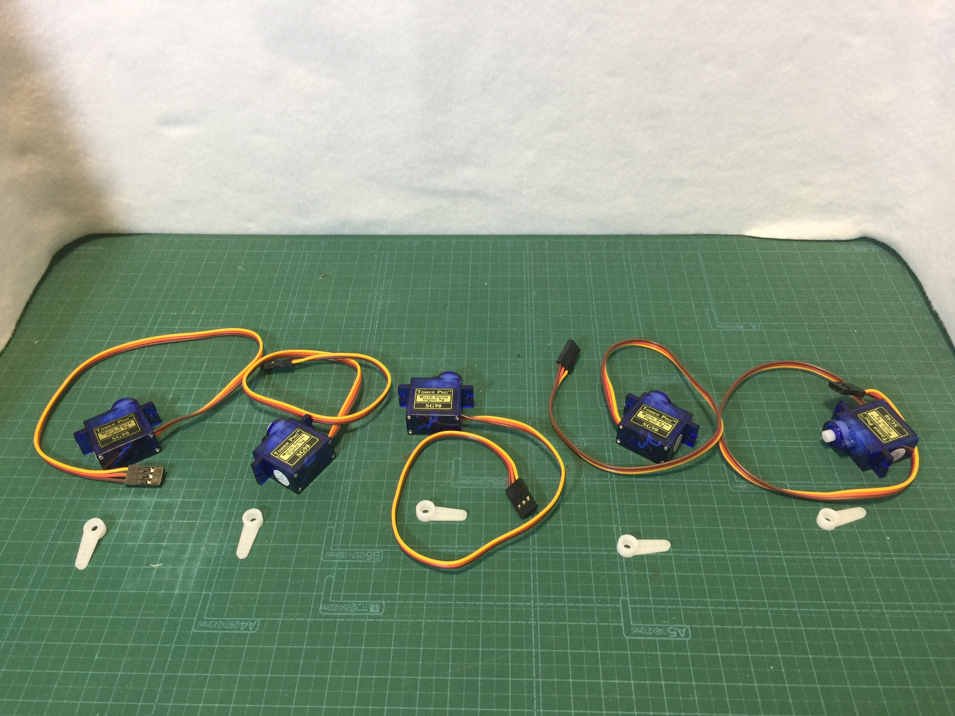 RCサーボモーター(Tower Pro の SG-90 digital)を3セット、あるいは5セット用意します。
