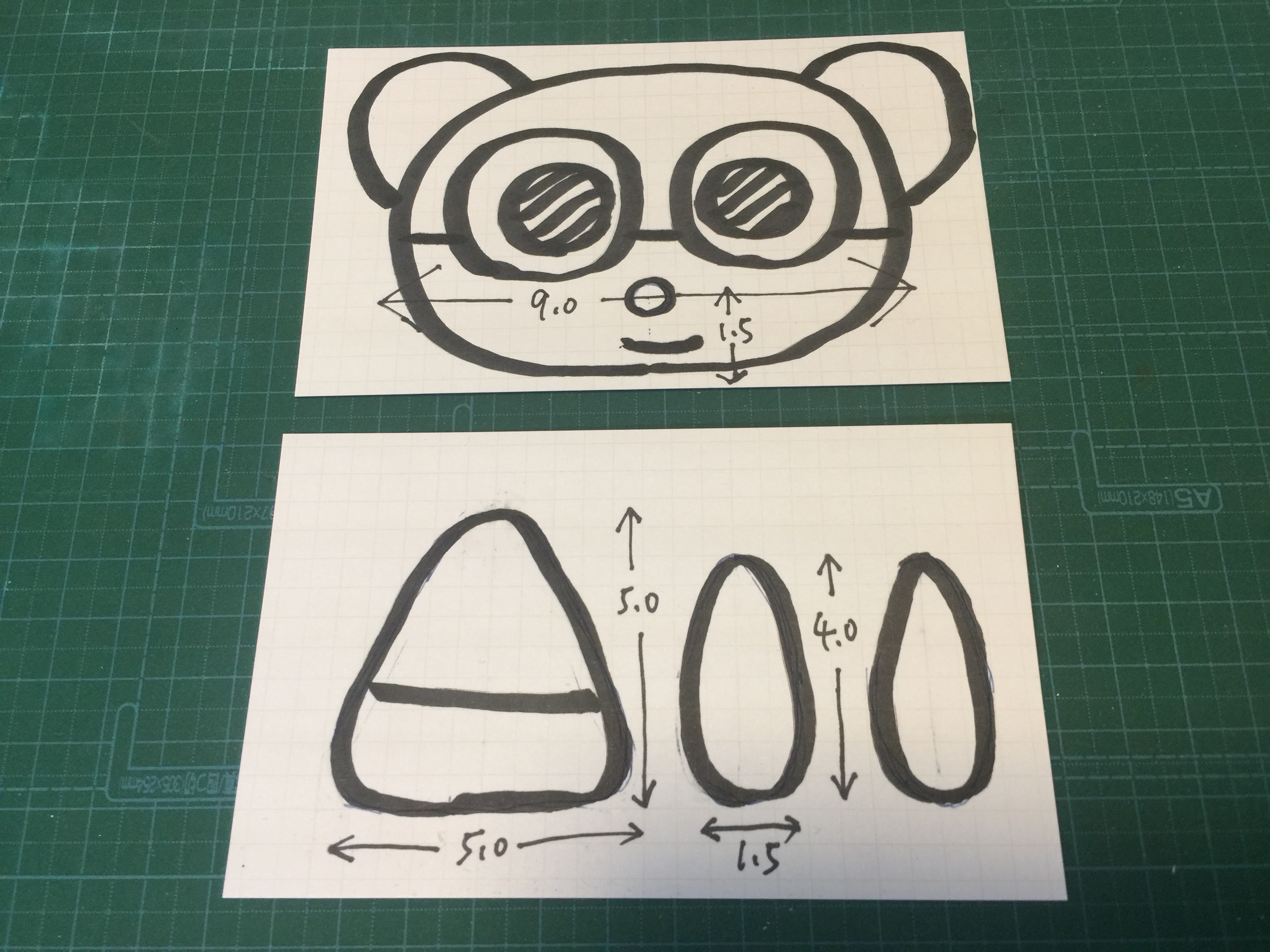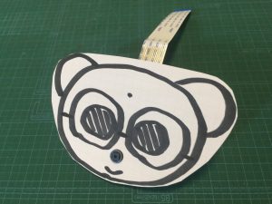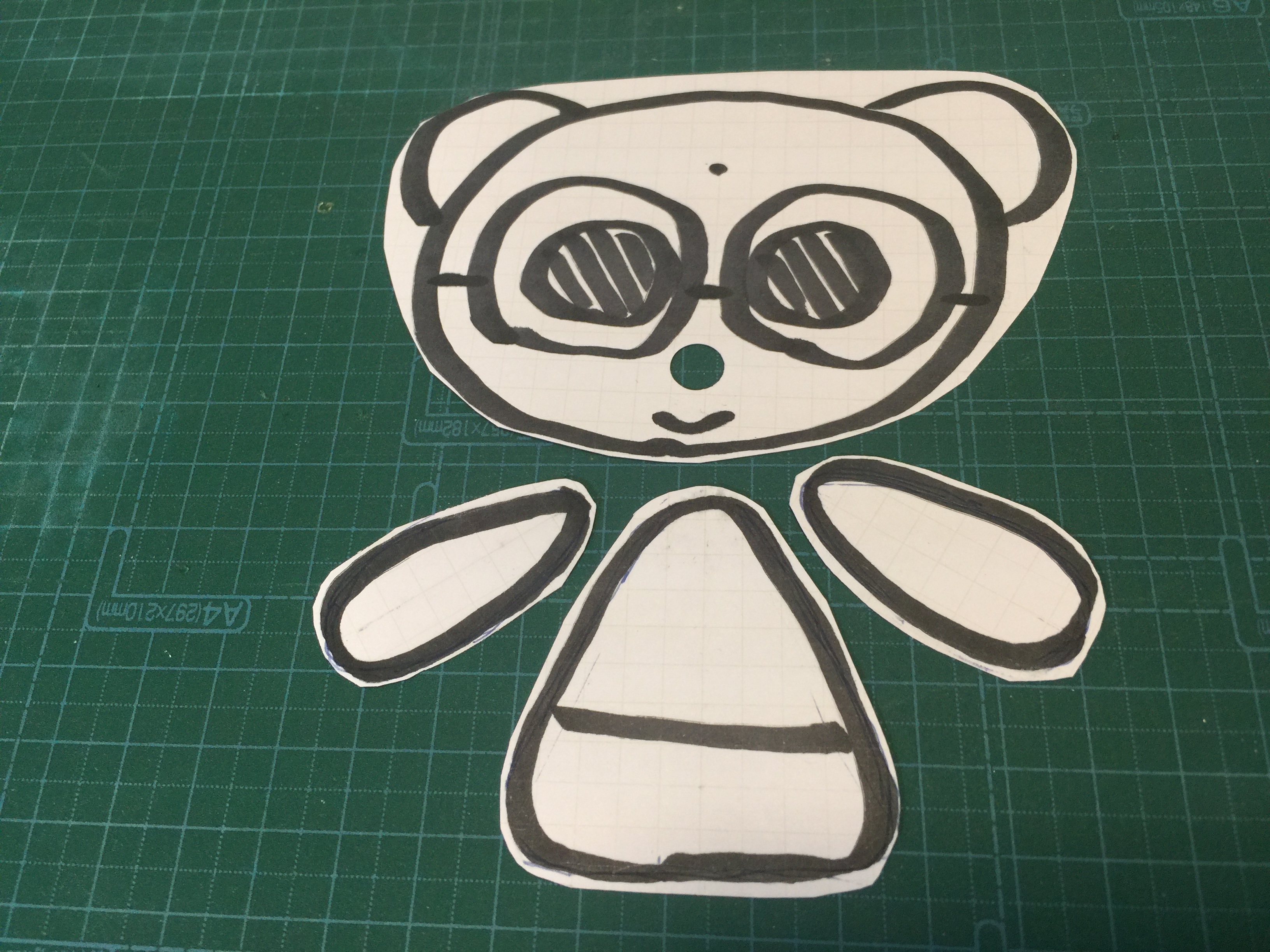 厚紙に顔と体と腕を描きます。大きさはだいたいで大丈夫ですが、顔の下端から1.5cmのところにカメラの窓が必要です。この穴を鼻、あるいはクチにするとよいでしょう。
