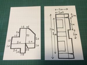 やはり厚紙を使って頭部と体のパーツを作ります。方眼が書いてある工作用紙などを使うと楽ですね。お菓子の箱を利用してもよいと思います。腕は動かなくてもいいという人は、体パーツは省略できます。