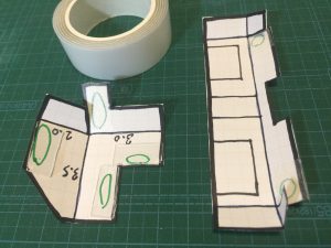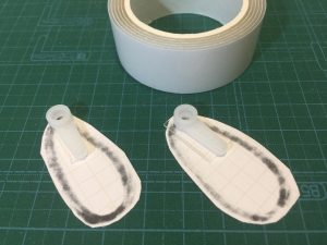 ハサミで切り取り、緑色の丸印がついているところに両面テープを貼ります。