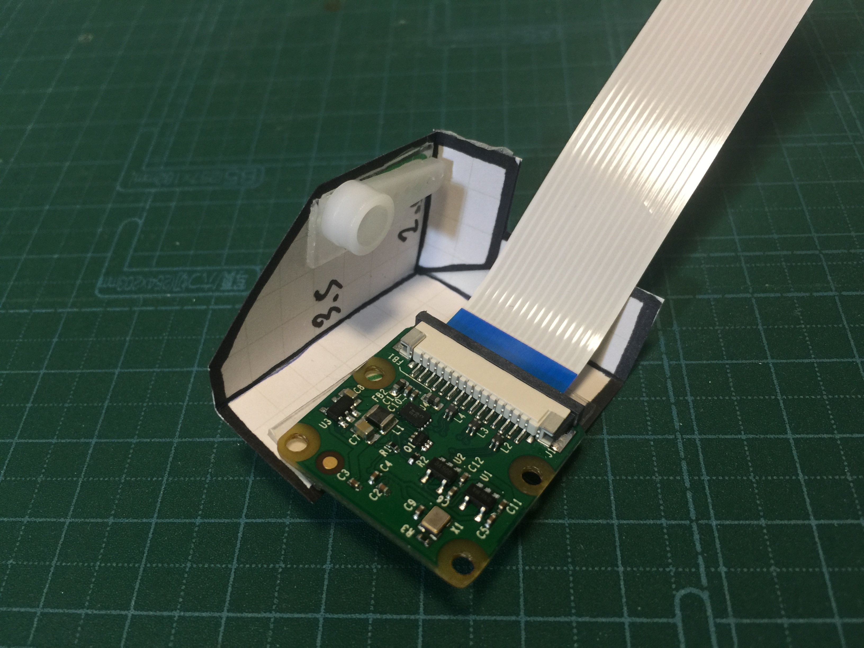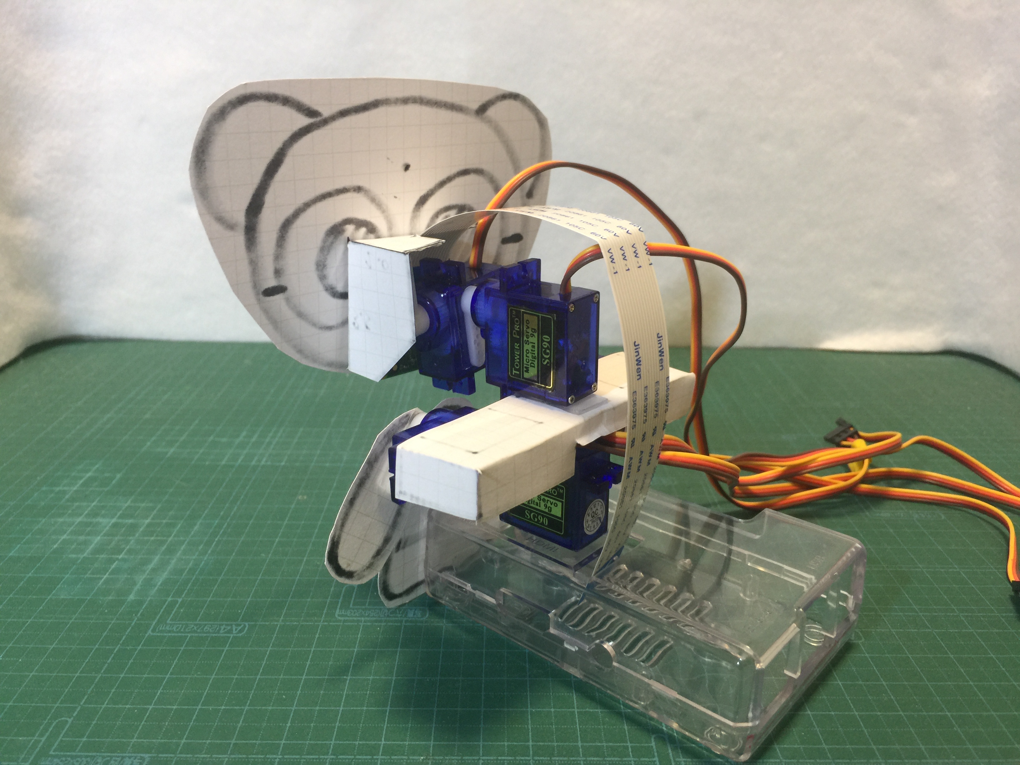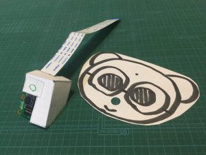 まずは頭部パーツを組み立てましょう。両面テープにサーボホーンとラズパイカメラを貼りつけます。