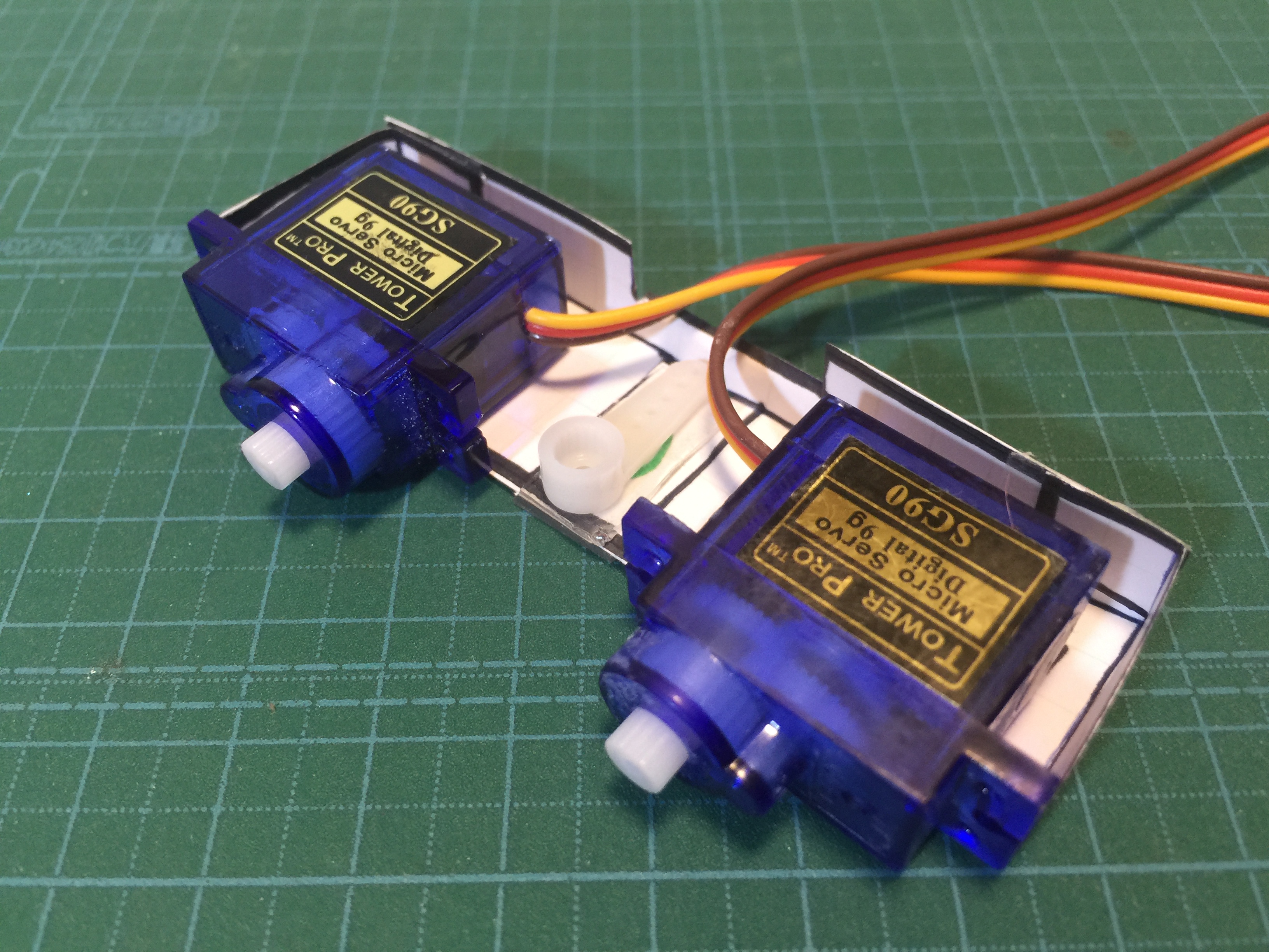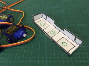 箱の内側に2つのサーボとサーボホーンを貼りつけます。これが腕になります。