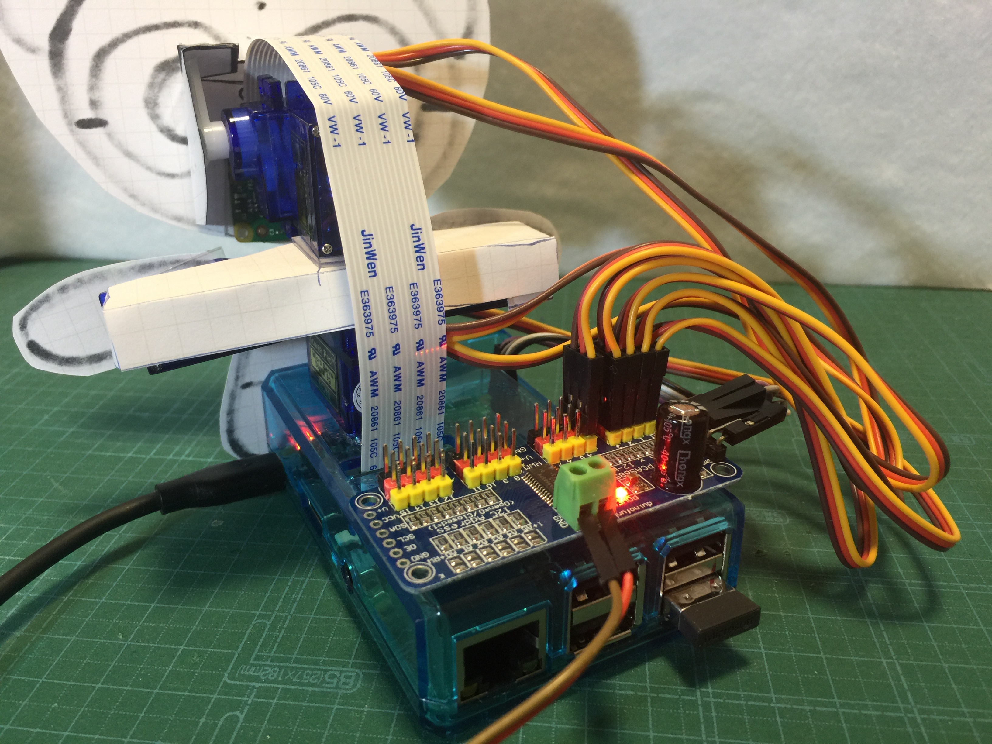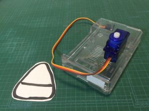 サーボをサーボドライバーボードに接続しましょう。サーボドライバーボードも両面テープでラズパイケースに固定してしまったほうがよいですね。