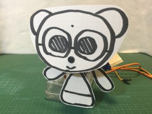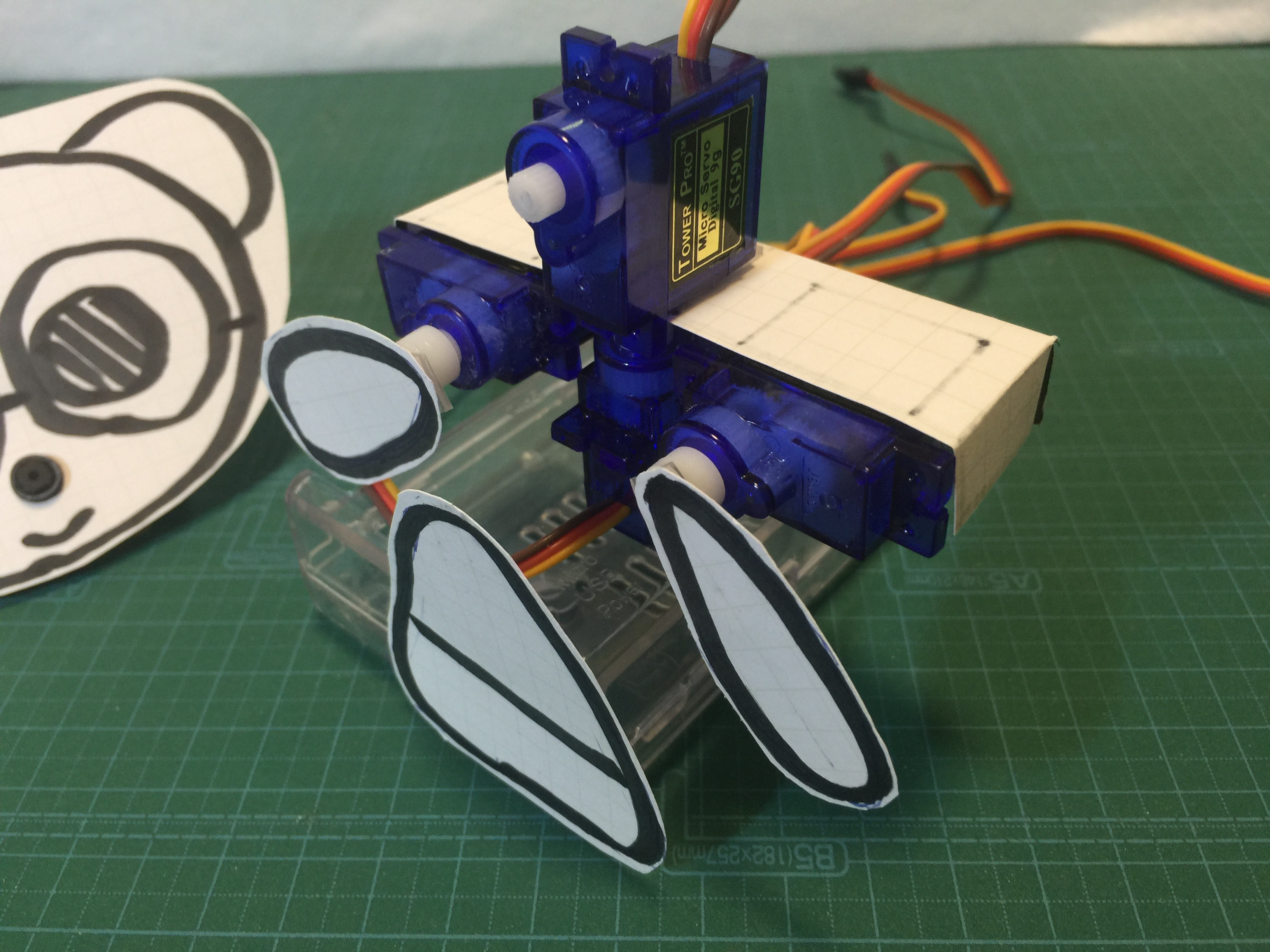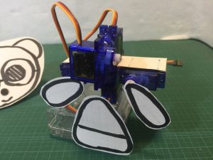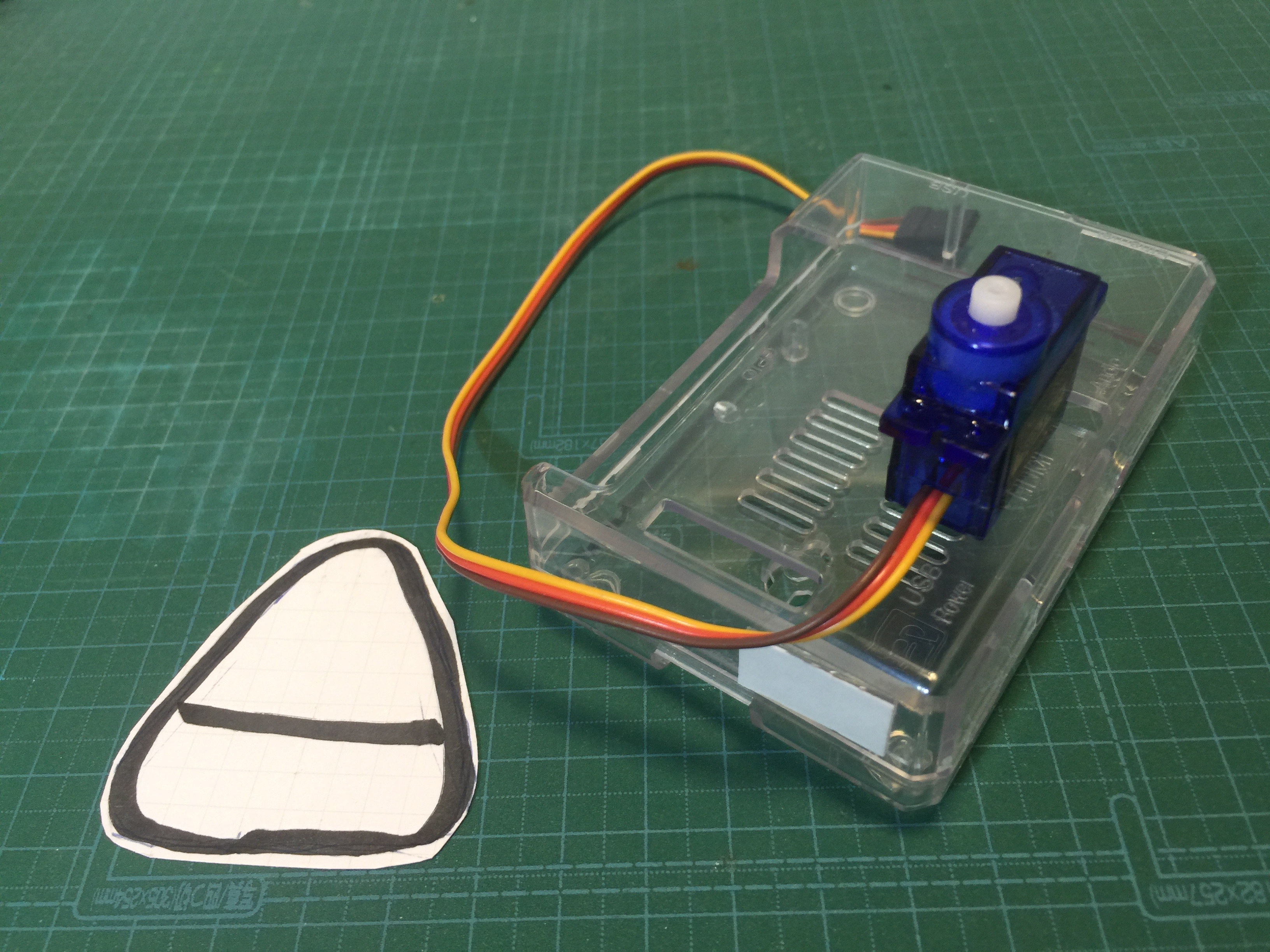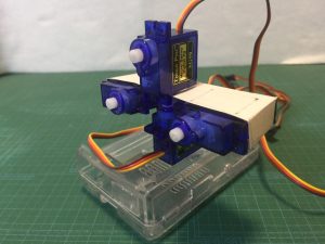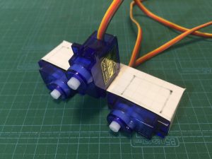 裏っかえして箱の表側にも両面テープでサーボを取り付けます。これが首になります。