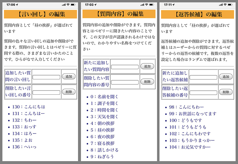 スマートフォンやPCのブラウザからべゼリーにアクセスし、質問と回答の組み合わせ(こう聞かれたら、こう答える)を編集することで、自分だけの対話ロボットにカスタマイズすることができます。