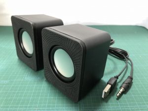 ・ラズパイのミニジャックから入力した音声を増幅するアクティブスピーカーです。電源はUSBからとります。
