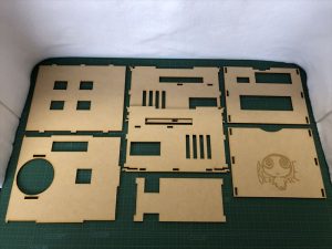 ・ベゼリーの台座です。2.5mm厚のMDF(中密度繊維板=Medium Density Fiberboard)をレーザーカッターで加工して作られています。べゼリー本体を固定するとともに、中にラズパイ、サーボドライバーボード、スピーカーを収容できます。
