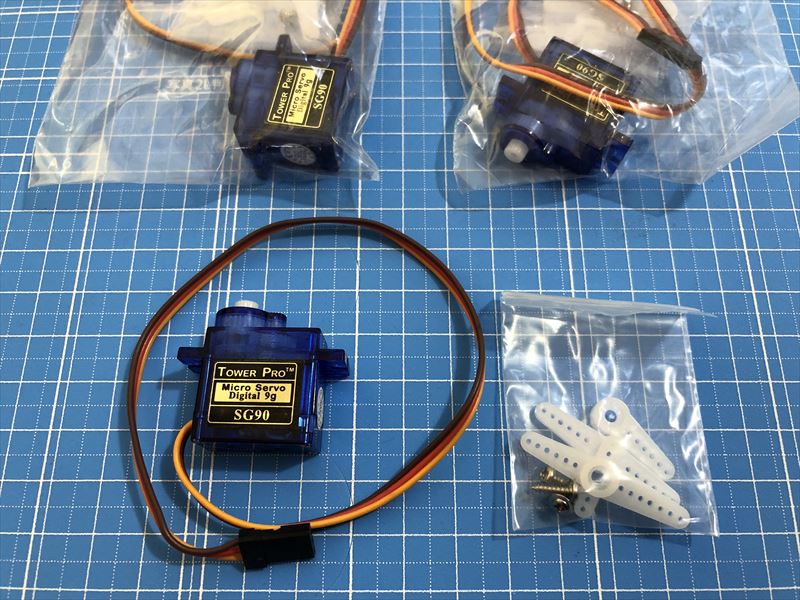 ・Tower Pro社のマイクロRCサーボSG90 digitalが3個付属しています。壊れやすいのが難点ですが、Amazonなどで1個400円ぐらいで買えます。