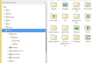 ・よく使うディレクトリなので「~」という特別な記号が割り振られているのですが、実際にはユーザーディレクトリは/home/piにあります。つまりユーザーディレクトリの上にはpiというディレクトリがあり、さらにその上にはhomeというディレクトリがあるわけです。しかしこれら上位階層のディレクトリにはOSを動かすための基本的なファイルが入っているので、初心者は触らないほうが無難です。
