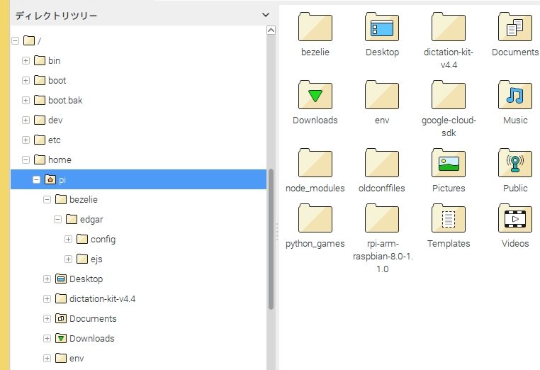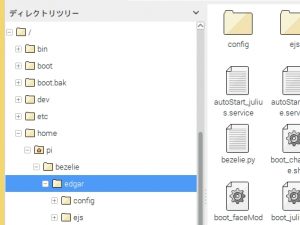 ・緑色のファイルが大量に表示されましたね。ベゼリー専用のプログラムがいっぱい入っているからです。青色はディレクトリ「ejs」「config」もあります。edgarの下にはさらに2つのディレクトリがあるのです。