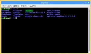 ・何やら文字がいっぱい表示されたと思います。lsはリストの略で、今いる場所にあるファイルのリストを表示するコマンドです。青色に表示されているのがディレクトリです。