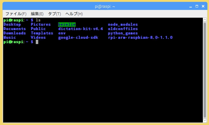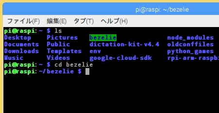 ・コマンドプロンプトの左の「:」と「$」の間が変化したのに気づきましたか?「~/bezelie」と表示されましたね。カレントディレクトリが「bezelie」という名のディレクトリに移動したのです。
