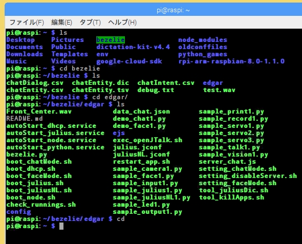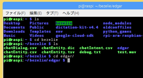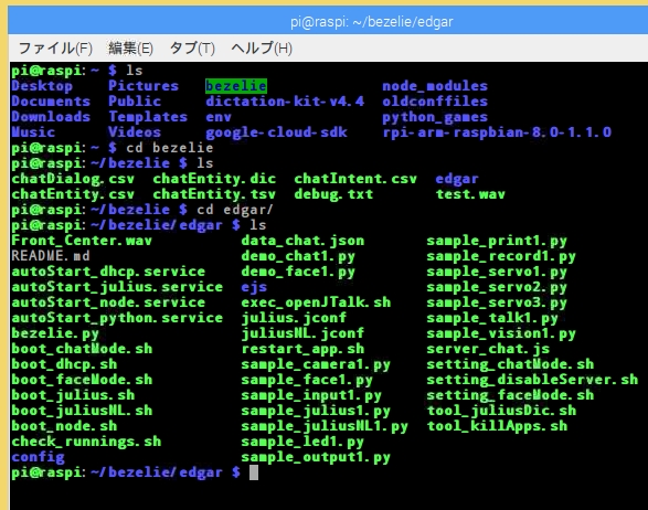 ・緑色で表示されている7つのファイルはべゼリーが使っている設定ファイルです。「edgar」と青く表示されているのはディレクトリです。つまり「bezelie」ディレクトリの下には「edgar」ディレクトリがあるわけです。edgarディレクトリの中に入ってみましょう。「cd edgar」と入力してみてください。
