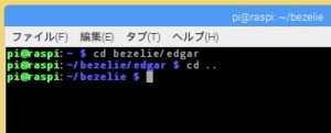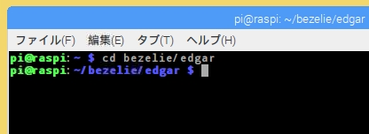・さて次は応用技です。ユーザーディレクトリから一発でedgarディレクトリまで移動してみましょう。「cd bezelie/edgar」と打ち込んでみてください。