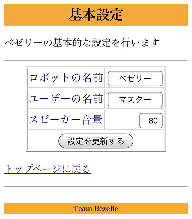 ・ロボットの名前&ユーザーの名前:デフォルトは「べゼリー」と「マスター」です。べゼリーが起動するとき、「こんにちは◯◯、僕は◯◯」と喋るのですが、このときの名称を変更することができます。