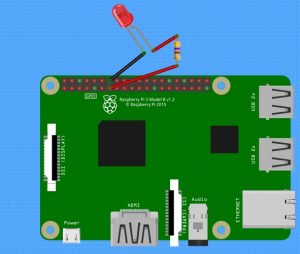 ・ラズパイGPIOの下段の左から7番目(GPIO 24)にLEDの長いほうの足(アノード)、その真上のPINに短いほうの足(カソード)を接続します。LEDの前でも後でもよいので、間に抵抗をはさみます。