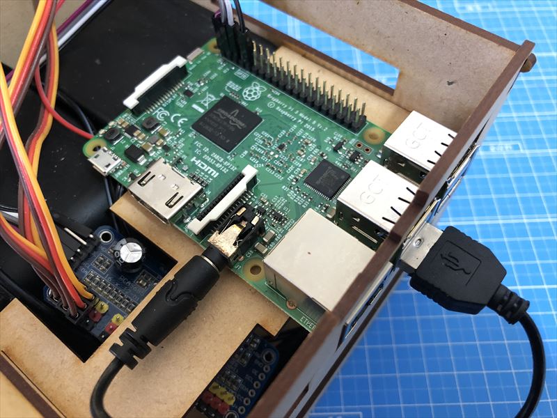・スピーカーのステレオピンジャックがラズパイのイヤホン端子に、USBオス端子がラズパイのUSBメス端子に接続されていることを確認してください。とくにピンジャックはしっかり差し込まないと、スピーカーからノイズが出てしまいます。
