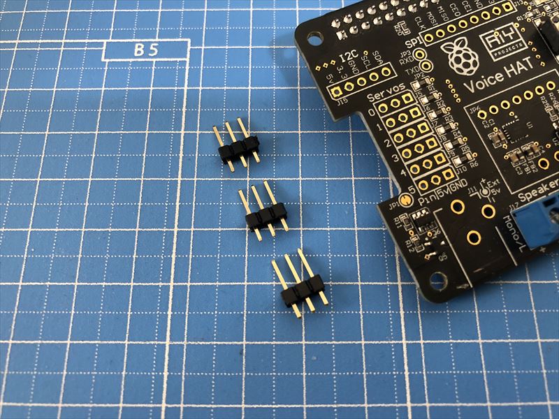 ・Voice HATにサーボをとりつけるには、ピンヘッダをハンダづけしなければなりません。3対のピンヘッダを3つ、Servo0、Servo1、Servo2にハンダづけします。3対のピンヘッダを買うのは難しいかもしれませんが、長いピンヘッダを買ってきてニッパーで切れば使えます。
