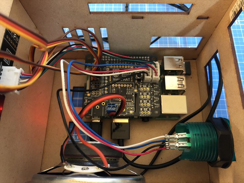・Voice HATをラズパイに差し込み、スイッチ、スピーカー、マイクを接続します。マイクは両面テープでべゼリーの台座の前面パネルに内側から貼り付けます。