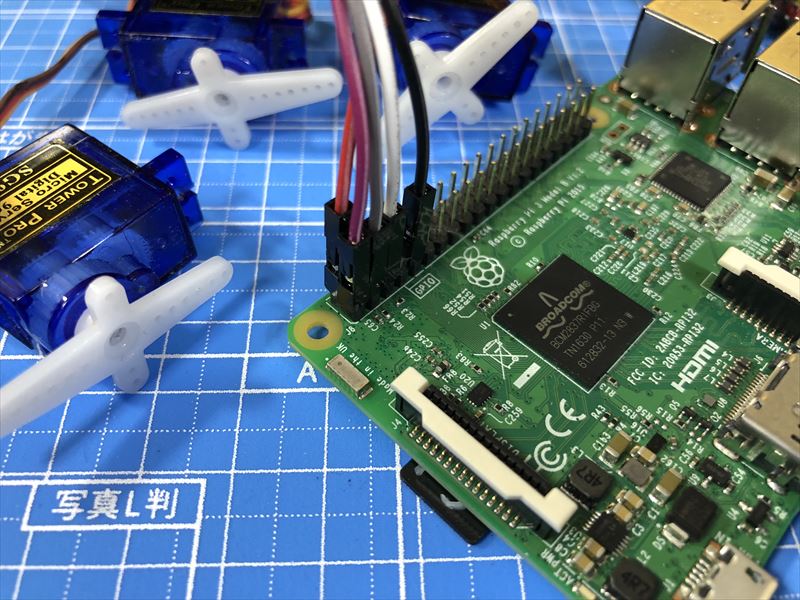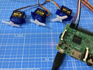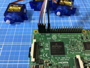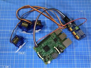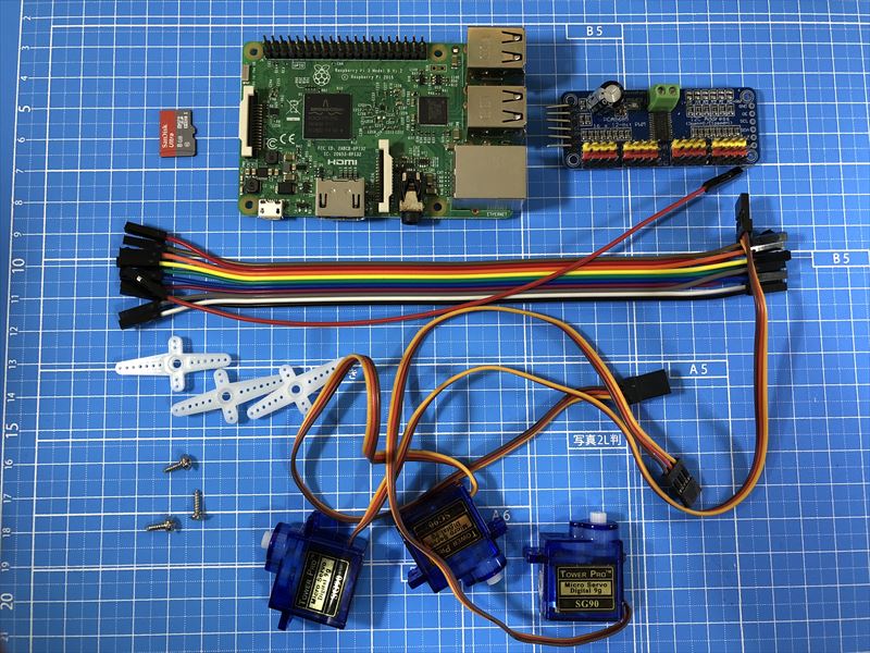 ・ラズパイ、SDカード、サーボドライバーボード、ジャンパーケーブル、サーボ3つを用意してください。