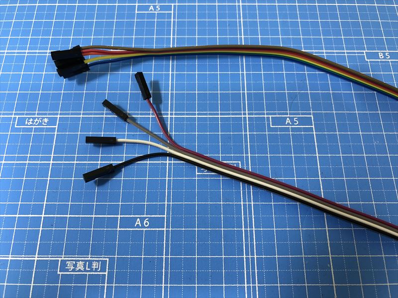 ・キットに付属している「メス-メス」ジャンパーケーブルは10本がつながってますが、4本だけ割いてください。何色を使ってもよいのですが、このマニュアルでは黒から紫の4本を使っているので、同じ色のほうが分かりやすいですね。
