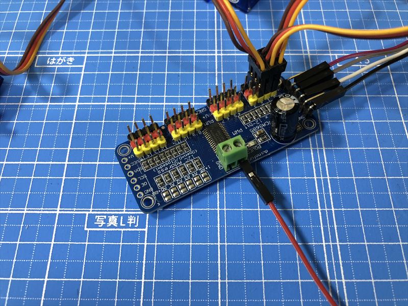 ・ジャンパーケーブルをサーボドライバボードに接続してください。ボードには6本の端子がありますが、そのうち4本だけ使います。ちなみに紫と黒が電源(紫がプラスで黒がマイナス)、灰と白が信号線です。
