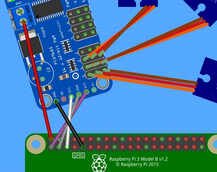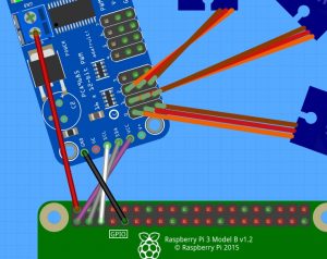 ・ジャンパーケーブルの反対側をラズパイに接続してください。ラズパイの端子(GPIO)は2列並んでますが、内側のほうに刺してください。ちなみにラズパイとサーボドライバーボードは「I2C」という方式でやりとりします。