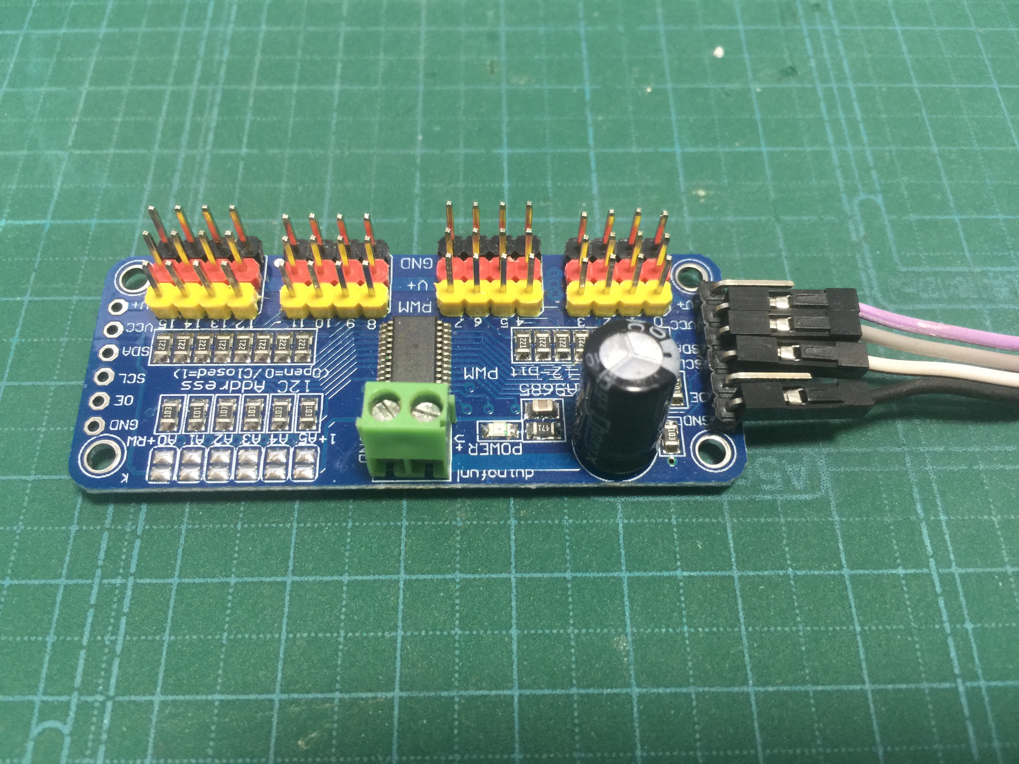 NXPのPWMコントローラPCA9685を搭載したサーボドライバボードです。ラズパイ単体ではサーボの制御は苦手なので、これもつけました。最大16個までサーボを制御することができます。