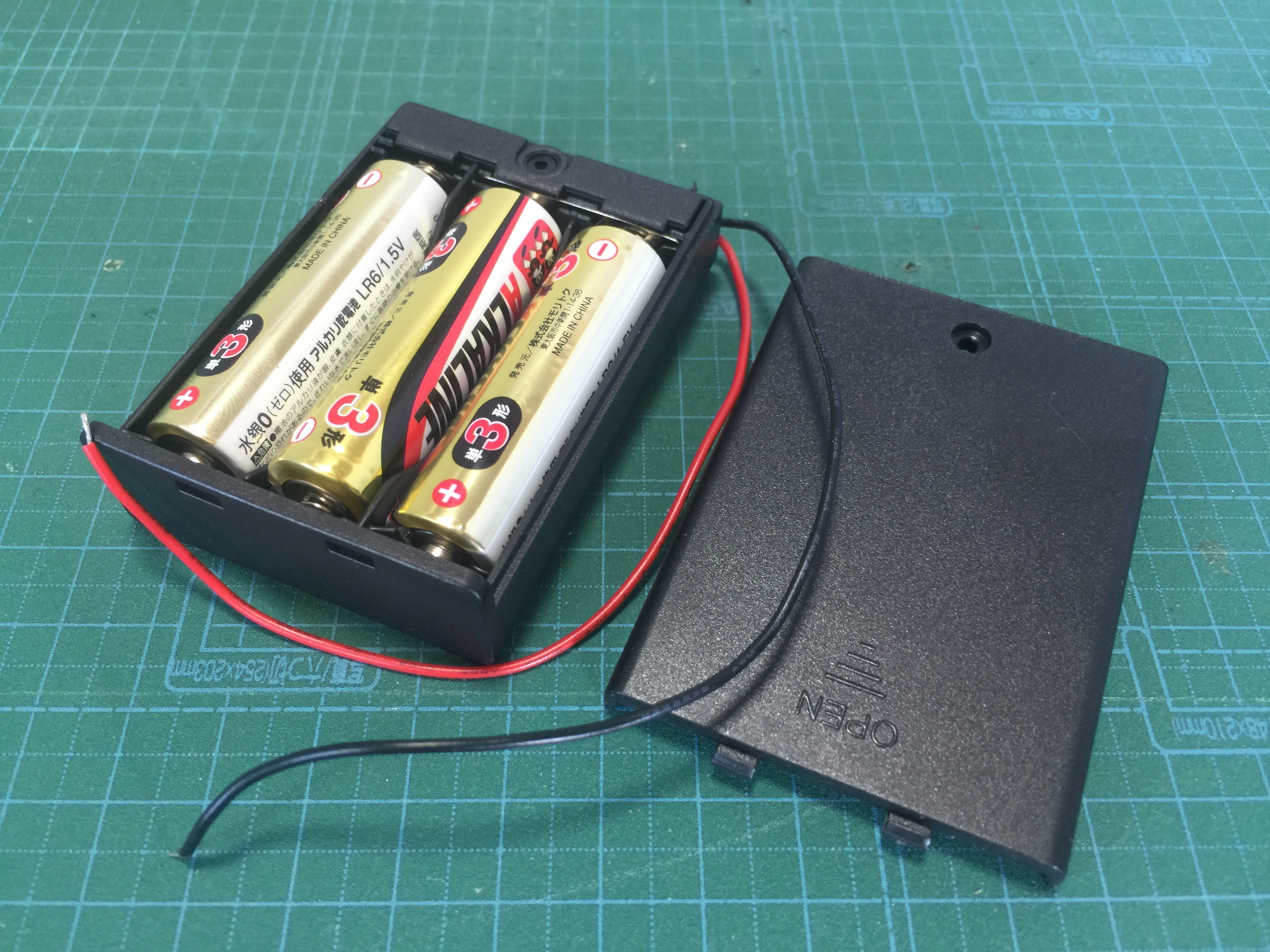 サーボは大電流を必要とするため、サーボドライバボードにも電源を接続します。電池ボックスは単3電池3本用です。箱の中にいれて持ち歩けるのが便利です。