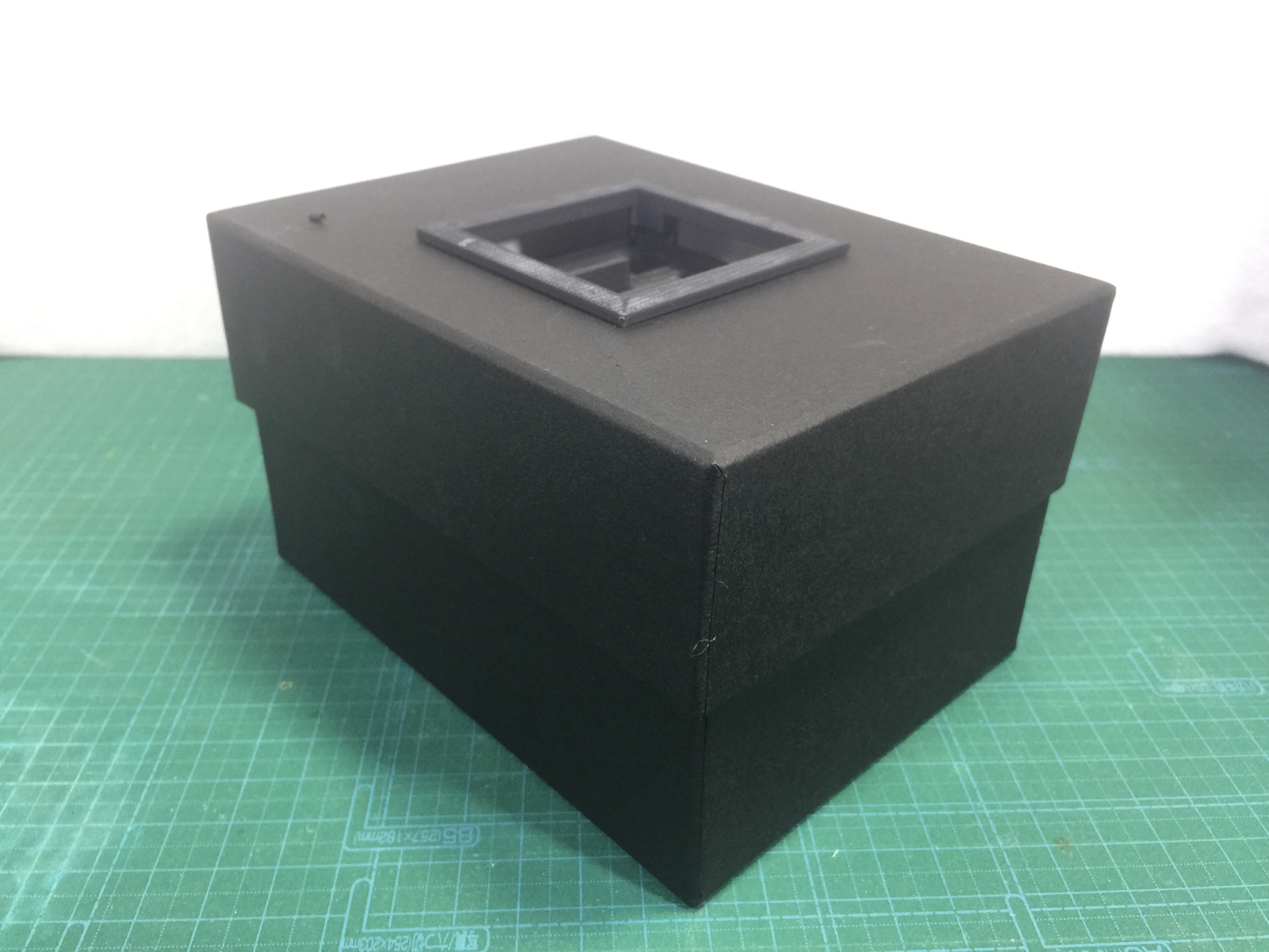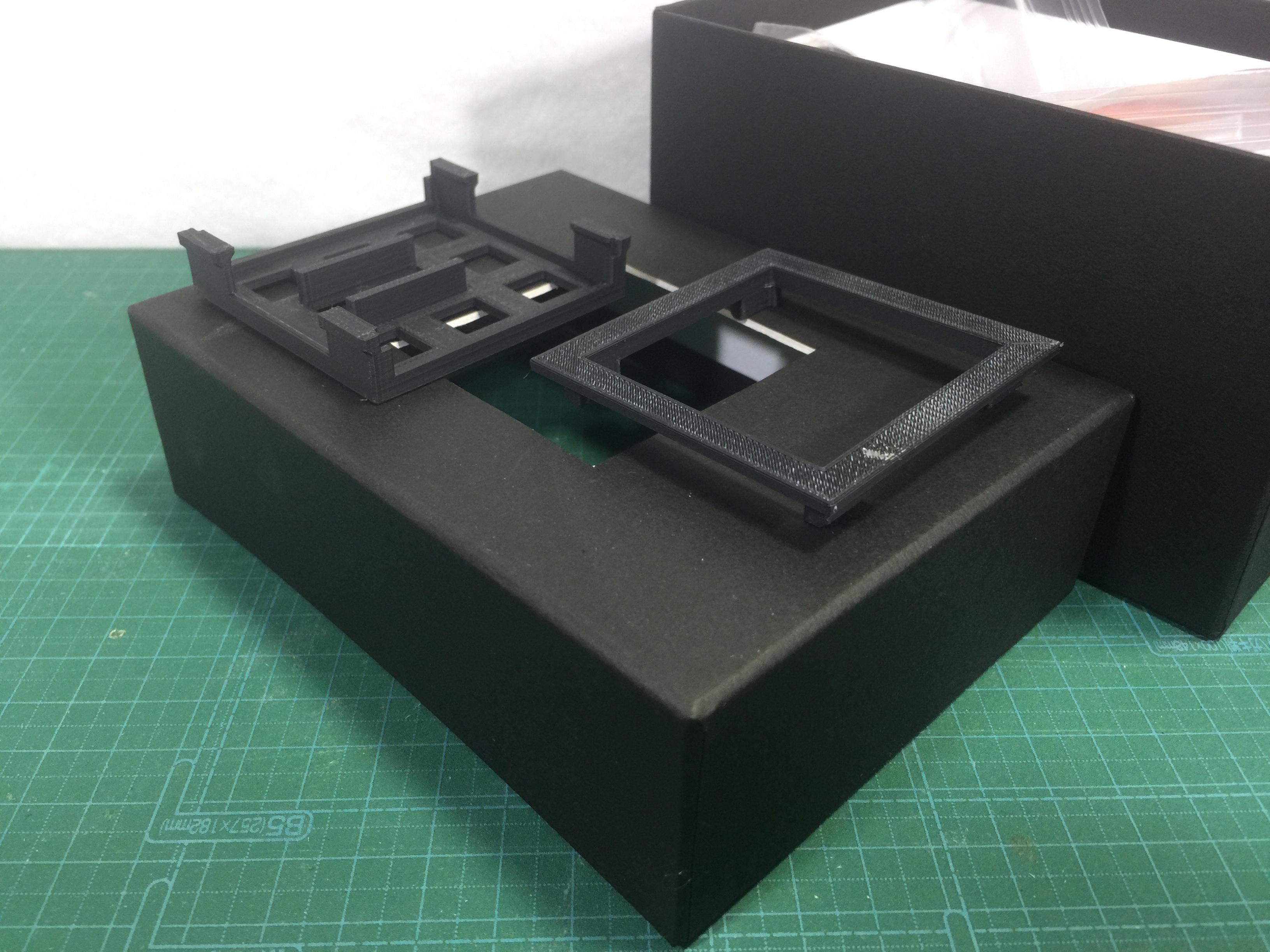 「ベゼリー Pi キット廉価版」は、漆黒の紙箱に入っています。上蓋にはサーボを固定するためのパーツが取り付けられています。