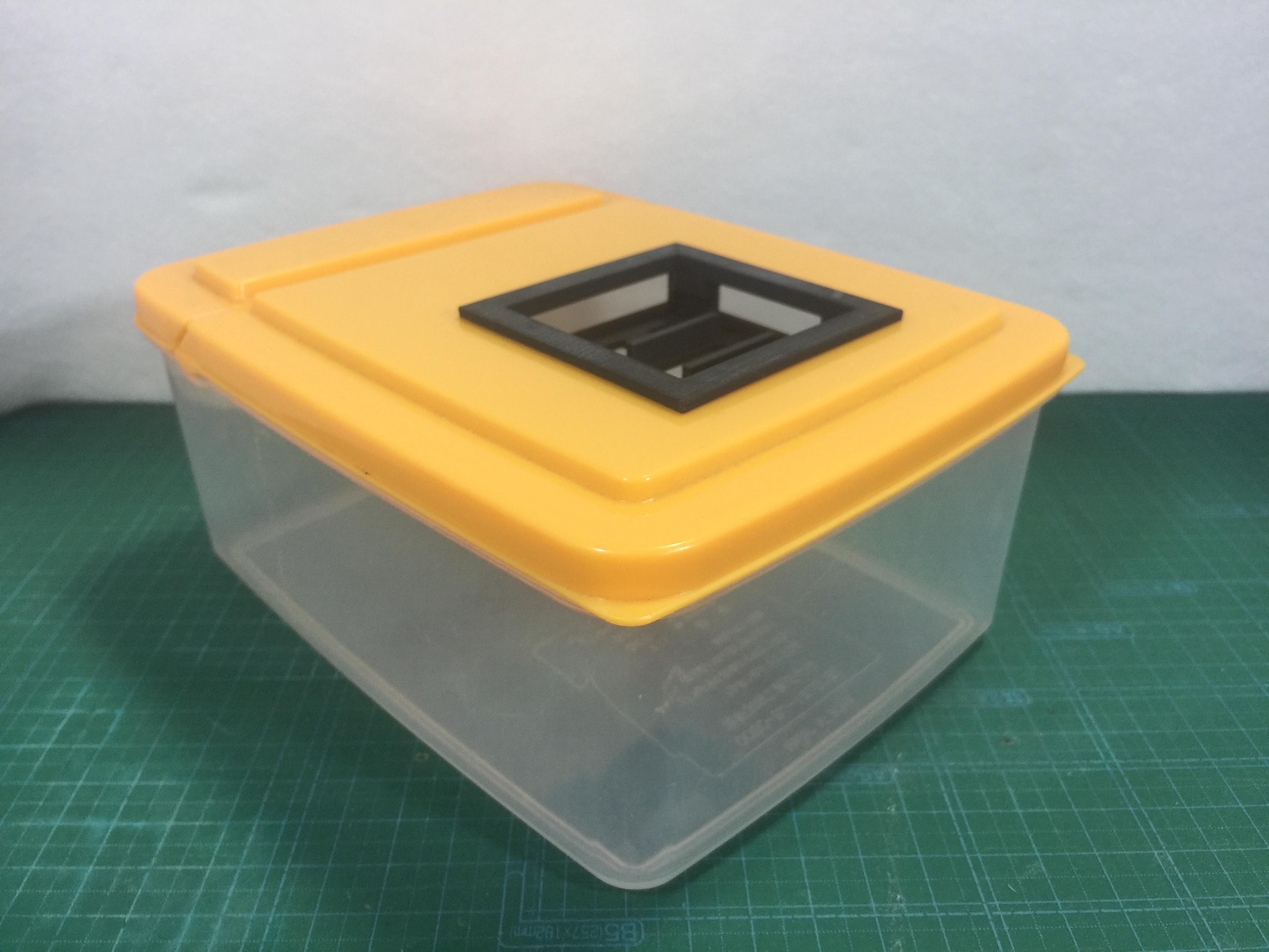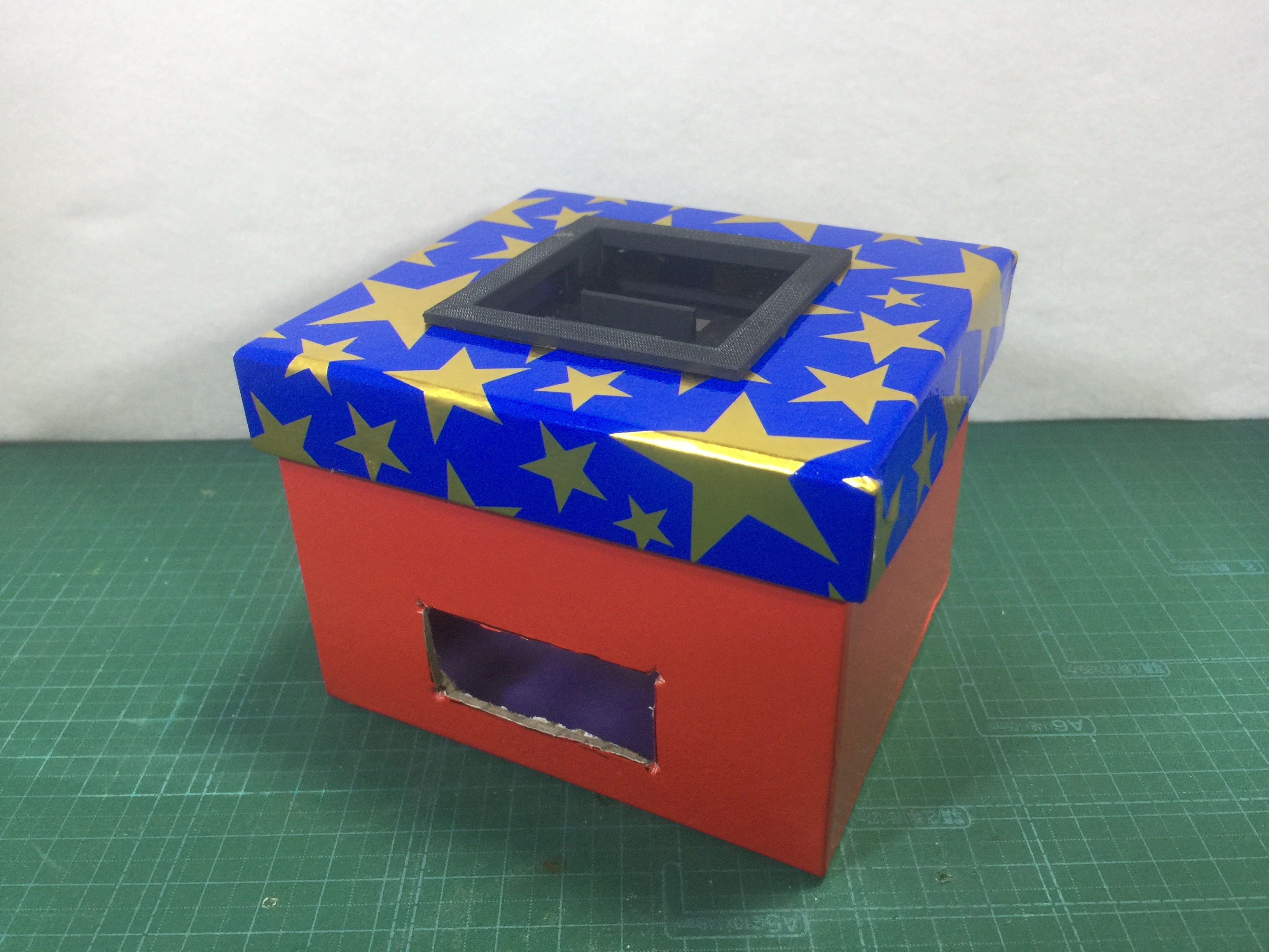5cm四方の穴を開ければ、お好きな箱にロボットを取り付けることができるわけです。以下は作例です。写真に映っている箱は付属しておりません。