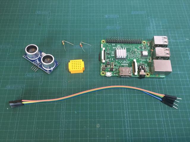 超音波距離センサーHC-SR04、抵抗(470Ω、220Ω)、ブレッドボード、ジャンパーケーブル(20cm, オス・メス)×4本を用意してください。