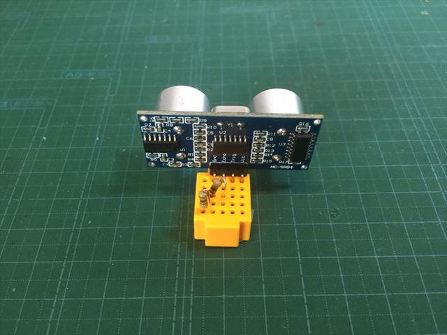 下の写真で言うと、左端の列は抵抗の片側がささっていて、HC-SR04の足はささっていません。