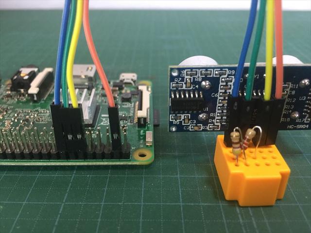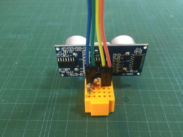 下の写真で言うと、青を抵抗列、緑をGND、黄をTRIG、橙をVCCに刺しています。