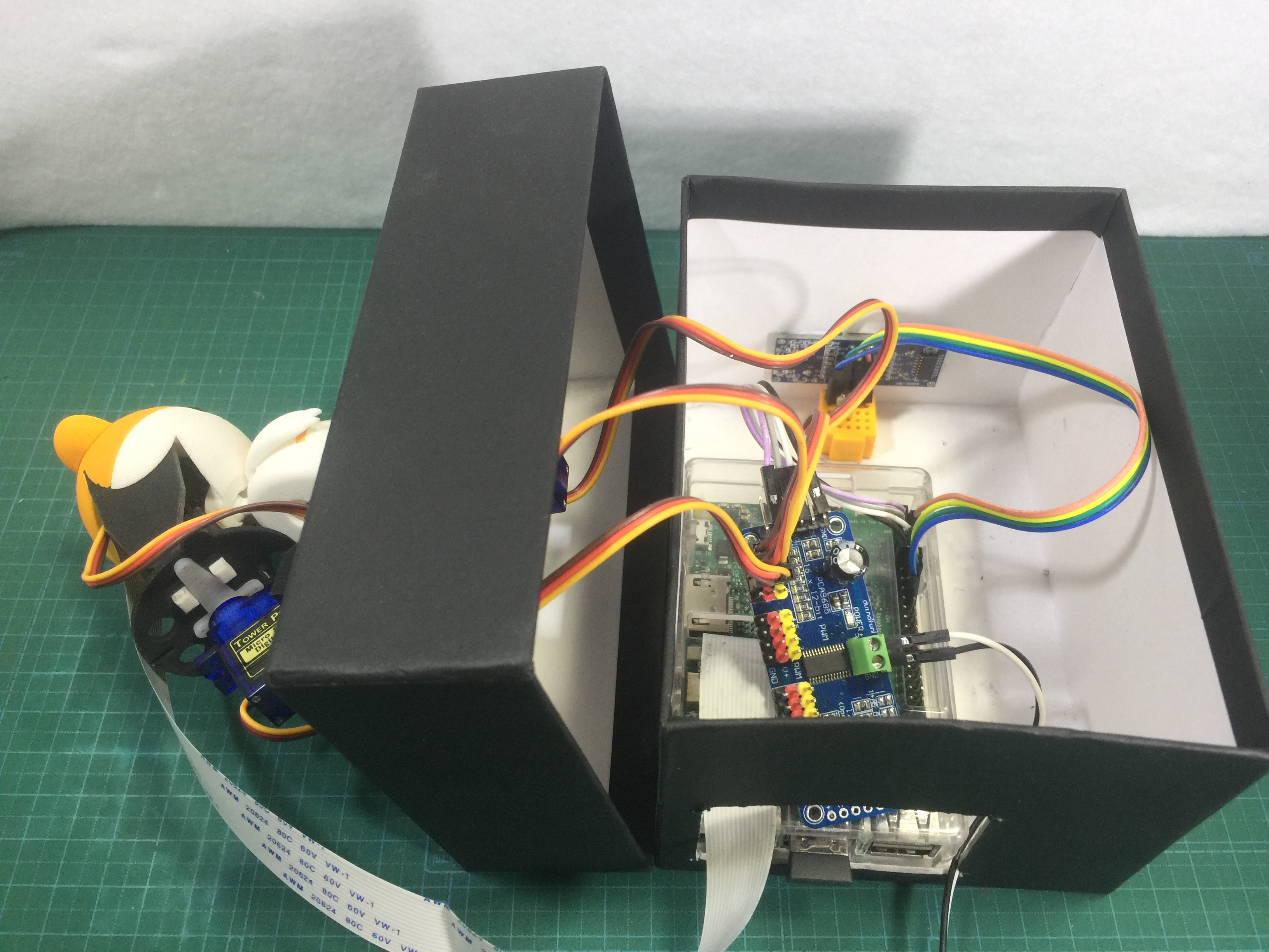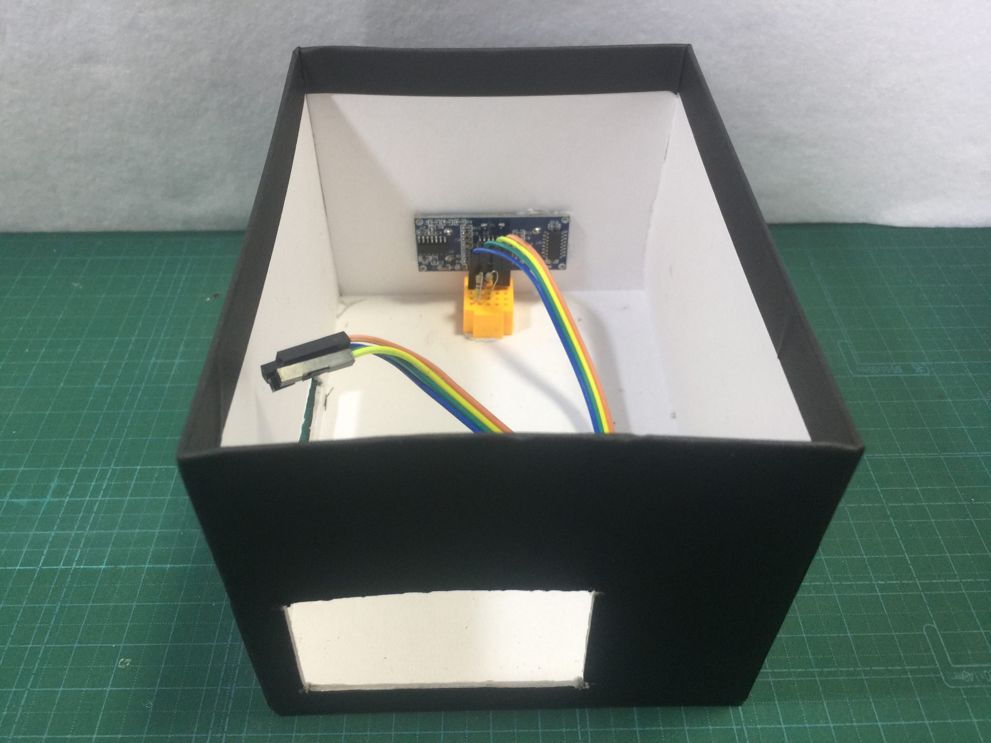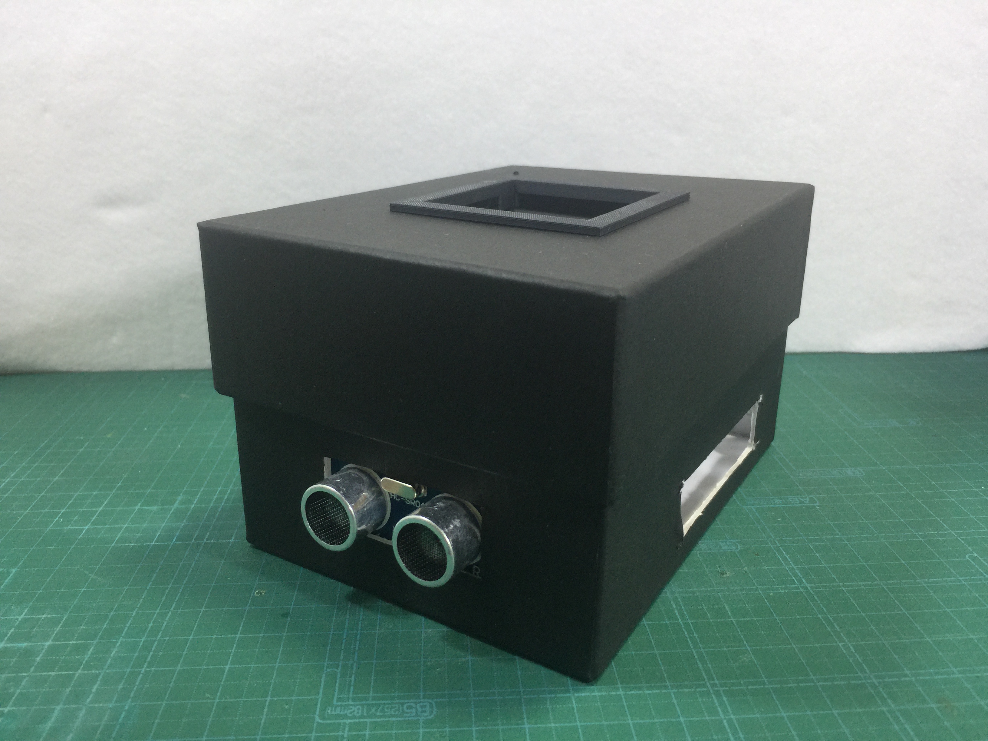 超音波距離センサーを箱に内蔵したい場合は、箱の前面にカッターナイフで穴を開けましょう。