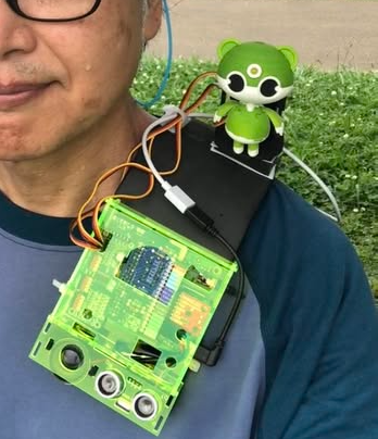 またRaspberry Pi本体をベゼリーから分離することで、ベゼリーと肩の距離を縮めました。慣性モーメントが小さくなることで安定さが増したと思います。さらに背中側にモバイルバッテリーをマウントすることで両端を重くし、安定させました。
